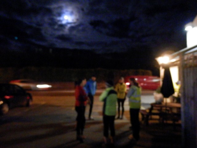 OK, I forgot! As stand in GM already I should've dobbed in a scribe, so I guess it's me! Well, it was dark. It was cold. The full moon was shining brightly! There was a good turn out of hounds for Shiggy Pop's first haring! Feels did some sweeping up on her wheels! Shiggy waited at the slippy bits to stop us falling! 'Twas too late for a circle as the pub wanted us to eat, so once again poor Rachel didn't get her long awaited hash handle! The food was lovely! Cheers to Shiggy. On on to Burton...