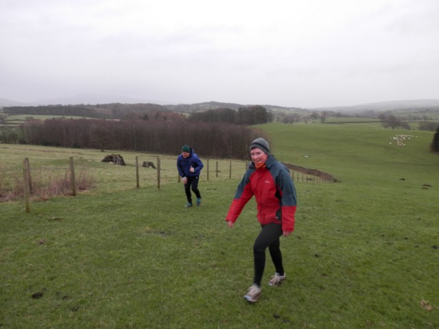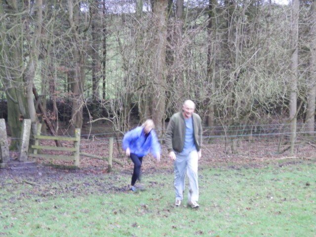 Soon back on high ground, lashed by the strong wind and light rain, we enjoyed good views across the Lune Valley. The Septics spotted two wild hares across the field; one of which could be clearly seen dragging a shopping trolley. Dropping down into Wrayton we passed through a smallholding of hens and prodigious egg-laying ducks. We fully expected to be back to Melling via the main road but the blobs took us back along an old track. Up through some woods and a gated plantation we again reached high ground, presumably back over the train tunnel, before dropping back onto Lodge Lane and into Melling.