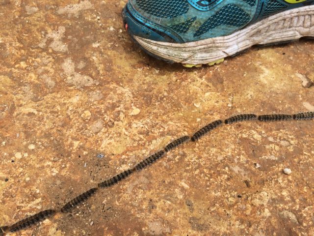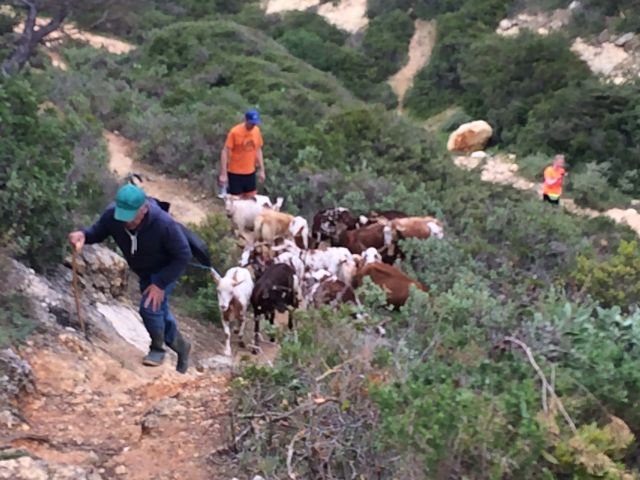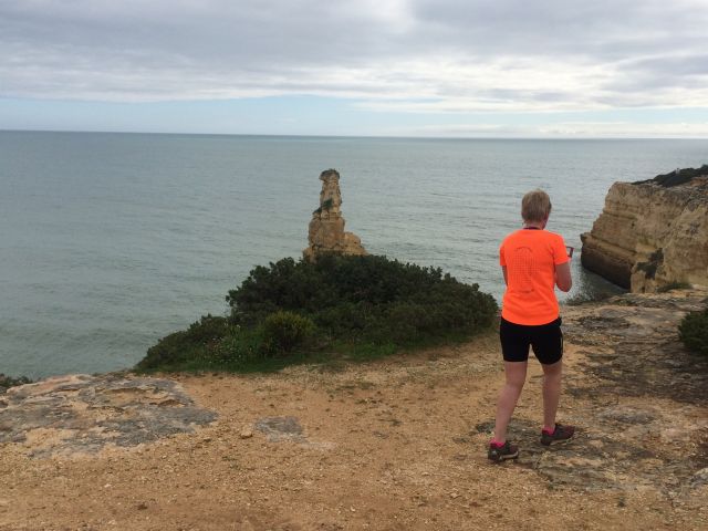 After a decent wait, we set off along the trail where we were amazed to see a head to tail line of caterpillars crawling across the path – unfortunately for them, but apparently fortunately for the pine trees they are decimating in the Algarve they met with a swift demise at the feet of the Algarve hashers. A little further on we met the wimps coming towards us – heading for the beer stop – were the front runners going to lower ourselves to back tracking? Tempting with hind sight – but we decided to carry on and found a distinct sense of Deja vue as we revisited the coast and views of stunning cliffs and a dramatic stone pillar. Inland again and we re-met the goats – you’ve got to be kidding!