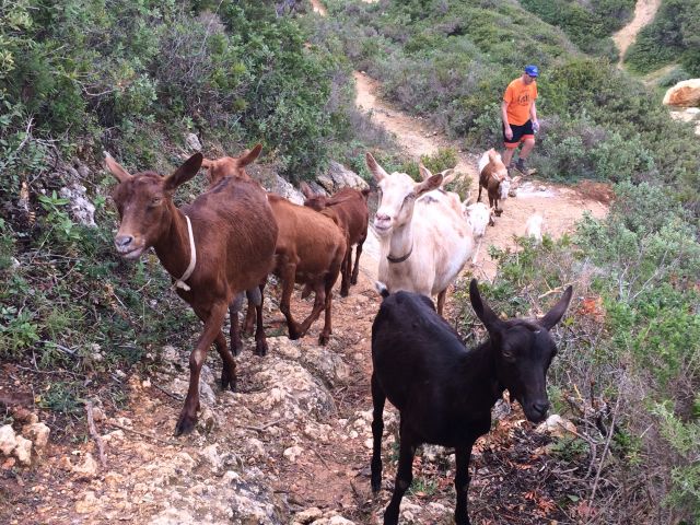 I am pleased and proud to say that LVH3 put their best feet forward and set of as FRBs right from the start, calling for all their worth as we proceeded through scrubby fields and scratchy bushes to dry and dusty paths – no shiggy here! – until we eventually made it to the coast and views of stunning cliffs and a dramatic stone pillar. Inland again and down a rocky path we had to give way for a goatherd and his goats – queue a rendition from Sound of Music. What a relief to see the sign of BS – but was there beer? – NOOO!