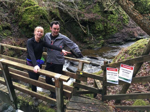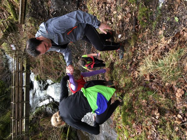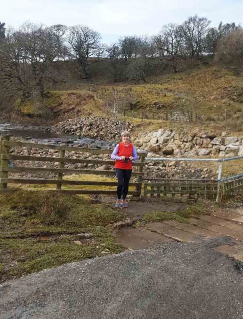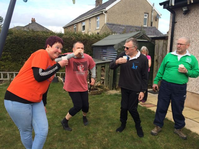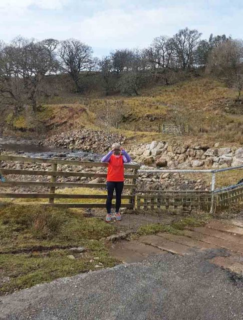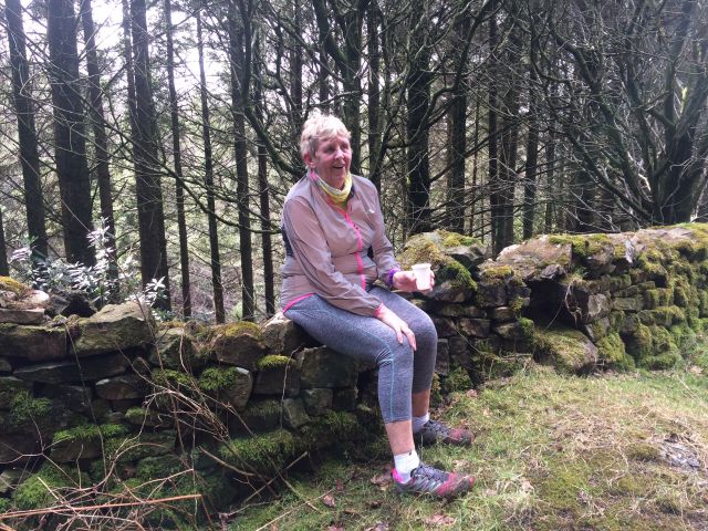 Rambos went back up the road and off into heath and wild moorland. Magnificent views of Ingleborough and fells beyond with even more magnificent shiggy to get in and over. Up and down dale we went, further into TBOB with fords and deep muddy furrows to negotiate. Thunder Dick was the real hero of the day, looking after us Harriets and keeping us safe - especially when we reached the missing footbridge and we were forced to rope ourselves together to keep safe up the steep ascent. I did have to give him some help with a hand on his bottom but he kindly chose to ignore this sexual harassment and thanked me! It was hard going and Group Sax reminded me constantly of my hunger having burped her breakfast up at least 9 times on the r*n (a Scotch Egg being the culprit I was informed). She redeemed herself by offering me a sweetie to keep me going till we finally reached the beer stop. We had just caught the Wimps up before the Beer Stop so a good result in my eyes (more choice of biscuit available) and it was lovely to be back in the bosom of the group.